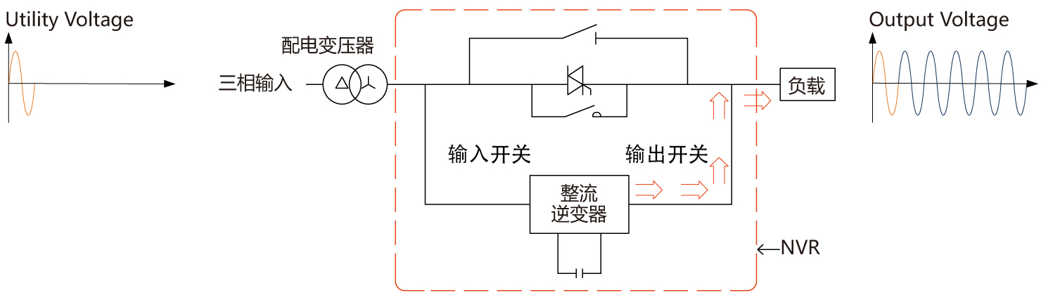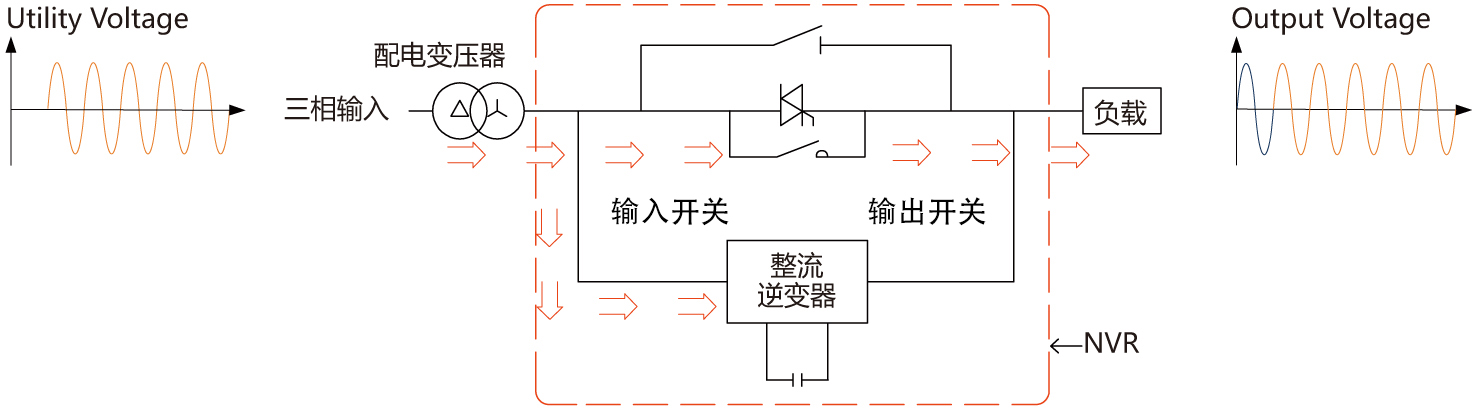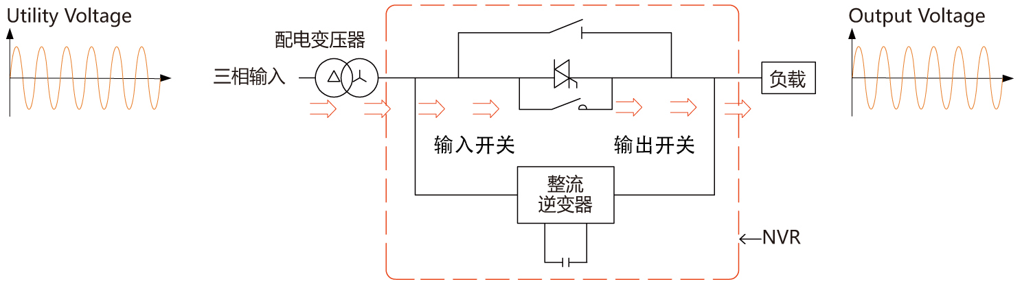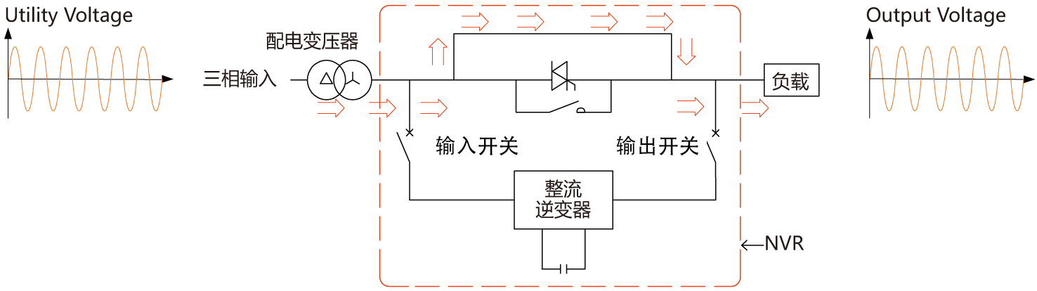 ? ?NVR故障或維護的情況下,負載電流將自動轉移到故障安全旁路。即電流將通過并聯于雙反接晶閘管的接觸器或旁路開關,直接向負載供電。